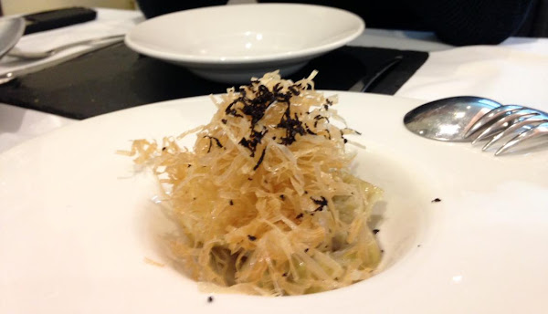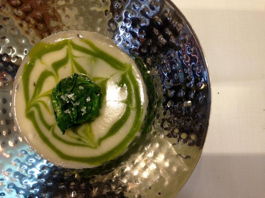 Si hay algo que me gusta del Daluan, es que además de cocinar muy bien presentan los platos de maneras muy diferentes y creativas. Aquí el bocado de vieira trufada en su hábitat verde.