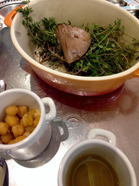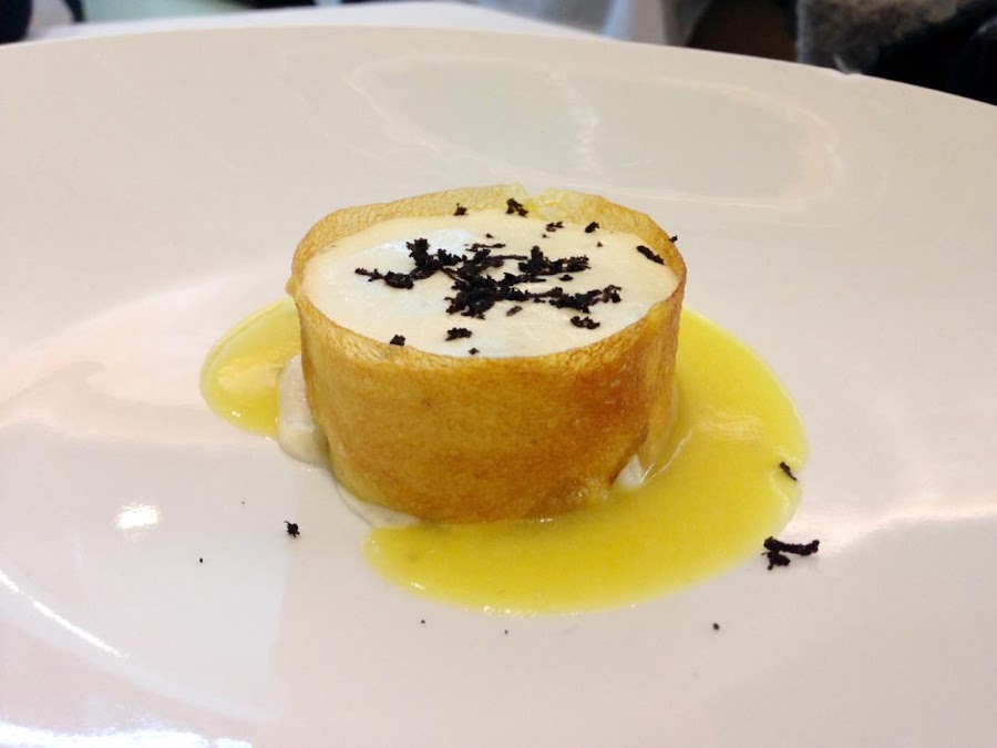 Llegamos ya al pescado, para mí el mejor plato de todos los que probé ese día: atún rojo ahumado con tomillo y acompañado con aceite de trufa. Qué atún más bueno, qué bien hecho, qué sabor. El ahumado de tomillo espectacular, acierto 100%.