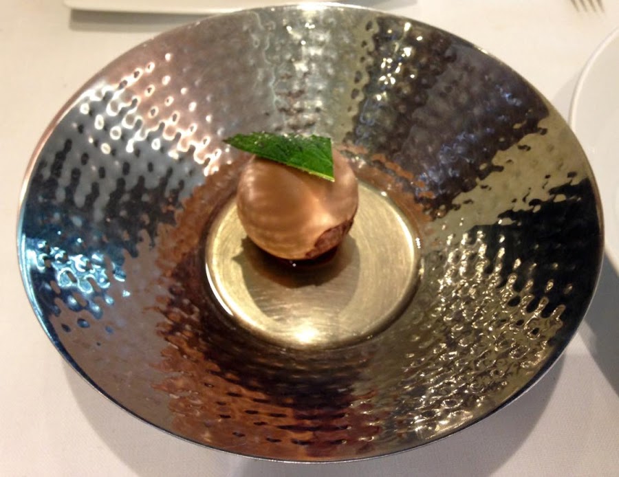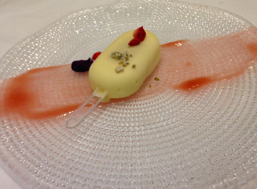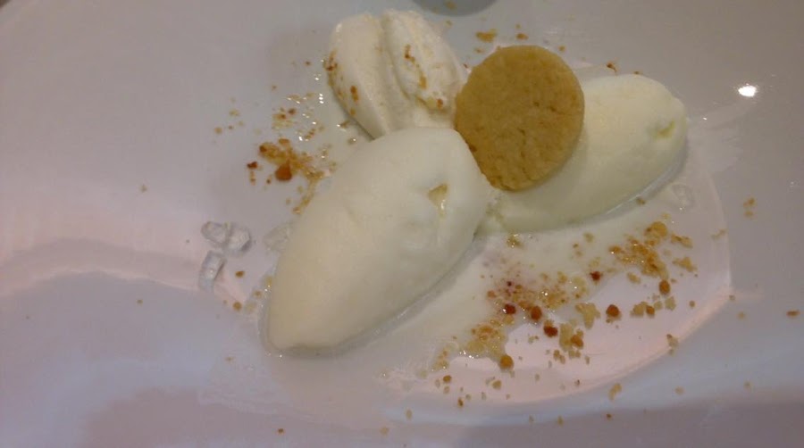 En los postres, pudimos degustar en primer lugar un sorbete de cítricos muy original, parecido a un helado de chocolate blanco por fuera, pero completamente diferente por dentro.