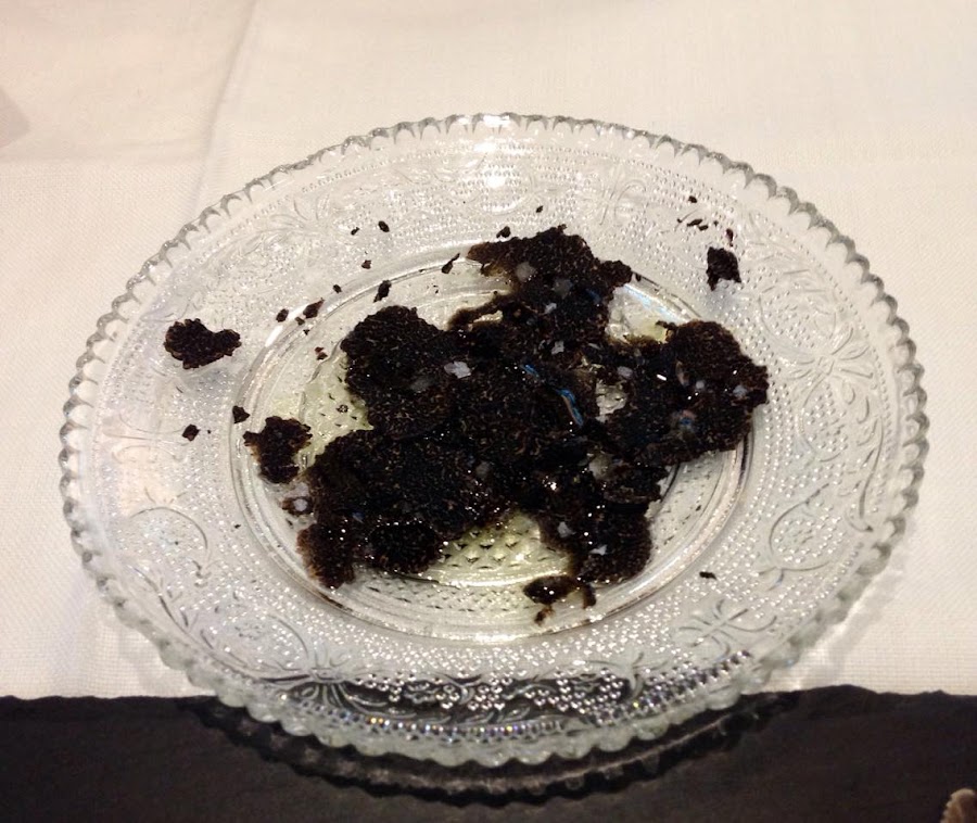 En primer lugar comenzamos con un carpaccio de trufa, aceite y pan. El fin de semana del 19 de marzo fue el último que Daluan podía garantizar servir este menú, ya que la temporada de la trufa negra se ha acabado. ¡Tuvimos mucha suerte!