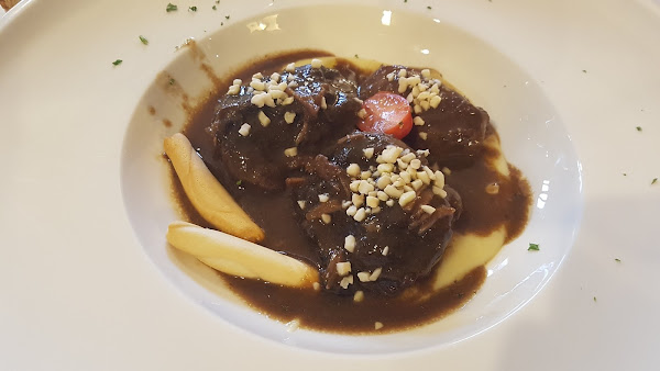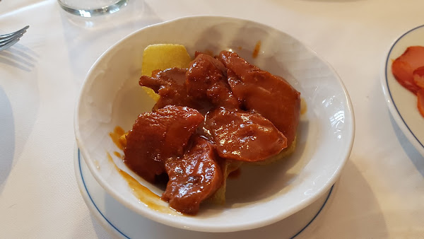 Después ya seguimos con los segundos platos que podías elegir entre cinco, nosotros éramos cuatro y cogimos dos de carrillera guisada al oporto y dos de manitas de cerdo deshuesadas con langostinos y patatas.