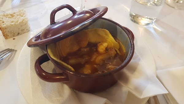 Manitas de cerdo deshuesadas con langostinos y patatas