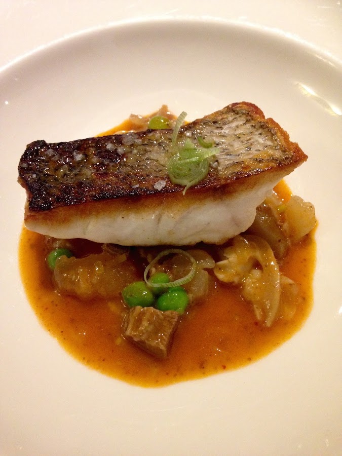 El siguiente aperitivo fue un salteado de alcachofas, navajas, salsa de curry verde y vieira. Uno de los platos que más le gustó a mi chico, y es que las alcachofas en esta época, si están bien hechas, son una delicia.