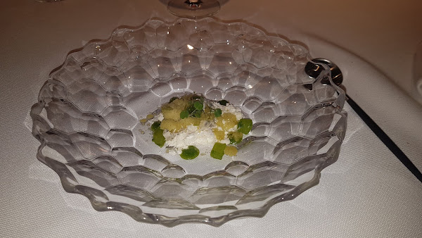 Continuamos con tendón gamba, tomatillo y cilantro, esto posiblemente fue el entrante que menos gusto en la mesa, creo que a esa gamba cruda le faltaba algo, no nos llamo demasiado la atención.