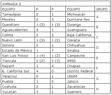 México, DF, miércoles 4 de junio de 2014.? La segunda jornada del Campeonato Nacional Scotiabank Sub-17 concluyó a las 16 horas de este martes 3 de junio y, aunque pareciera vislumbrarse cuáles serán los representativos que pudieran pasar a la siguiente fase, los giros sorpresivos entre los dos primeros días de actividades invitan a ser cautelosos con el pronóstico.