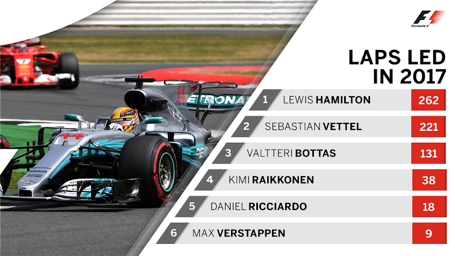 Pese a ser el líder del mundial, Sebastian Vettel, no es el piloto que más vueltas ha completado siendo el líder de las carreras, por el contrario, encontramos a Lewis Hamilton encabezando dicha lista.