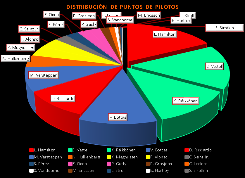 Hasta ahora, Hamilton lleva 213 puntos, 4 victorias, 4 pole position, 1 vuelta rápida y 8 podios, por su parte, Vettel cuenta con 189 puntos, 4 victorias, 5 pole position, 1 vuelta rápida y 6 podios. Las victorias se han repartido entre ambos tetracampeones y los pilotos de Red Bull, siendo Daniel Ricciardo el ganador en 2 ocasiones y Max Verstappen en una ocasión, de este modo, Red Bull se ha consolidado como la 3era potencia de la parrilla, por otro lado, los pilotos secundarios de Mercedes y Ferrari, Valtteri Bottas y Kimi Raikkonen, no han conseguido victorias, pero llevan 132 y 146 puntos respectivamente.