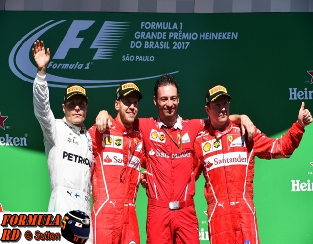 Sebastian Vettel puso fin a la sequía de victoria de Ferrari después de superar a Valtteri Bottas en el inicio del Gran Premio de Brasil, mientras que Kimi Räikkönen se resistió a la remontada de Lewis Hamilton para tomar el último peldaño del podio. Vettel tomó la punta en la S de Senna, la primera curva, desde el inicio de la contienda el finés de Mercedes demostró tener un ritmo inferior al de su contraparte de Ferrari.