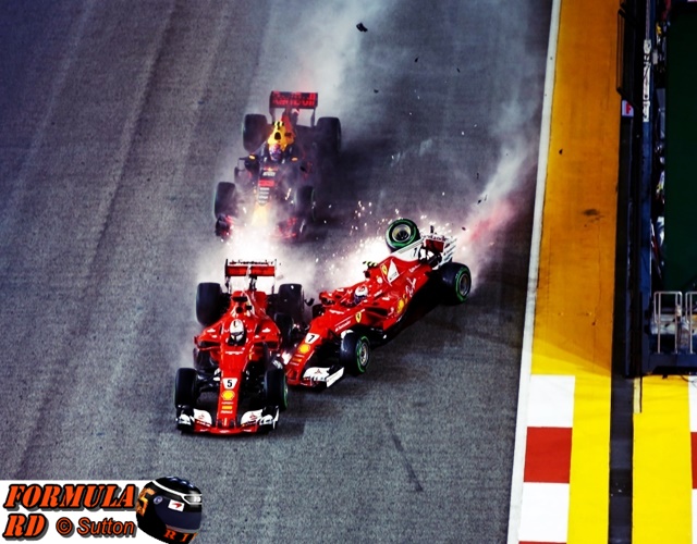Lewis Hamilton consiguió una victoria fácil en el GP de Singapur, carrera en la que ambos Ferrari, junto a Max Verstappen, colisionaron antes de llegar a la curva 1. Daniel Ricciardo fue 2° y Valtteri Bottas completó el top 3. A partir de la colisión entre ambos Ferrari, lo que prometia ser una contienda apasionante se convirtió en una procesión tensa una vez que los escombros fueron despejados. La carrera comenzó con una llovizna sobre el circuito de Marina Bay, la cual dio resultado una pista húmeda que llevó a la mayor parte de la parrilla a usar los neumáticos intermedios.
