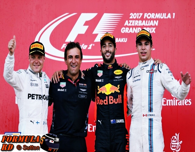 El piloto australiano consiguió una victoria complicada en el accidentado GP de Azerbaiyán, el cual también estuvo marcado por la polémica entre una serie de contactos ilegales entre los contendientes del título. Valtteri Bottas pudo conservar la segunda posición, aunque pudo acceder a ella en los metros finales a la carrera, ya que hasta ese momento, el canadiense, Lance Stroll, la ocupaba y al final se quedó con la P3. Ricciardo, que comenzó 10º, después de estrellarse en la calificación, se benefició de una carrera llena de coches de seguridad en el Baku City Circuit, siendo uno de los pocos pilotos que se mantuvieron al margen de los problemas.