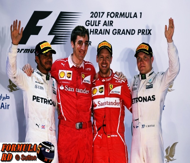 Sebastian Vettel ganó el GP de Bahrein 2017, tercera cita del mundial, imponiendose ante Lewis Hamilton, el 2° mejor clasificado, y Valtteri Bottas, quien completó el podio. Con este resultado, el alemán se ha convertido en líder absoluto del mundial y vuelve a tener una ventaja de 7 puntos frente al británico del equipo Mercedes, además, ha conquistado su triunfo número 44 en la máxima categoría.