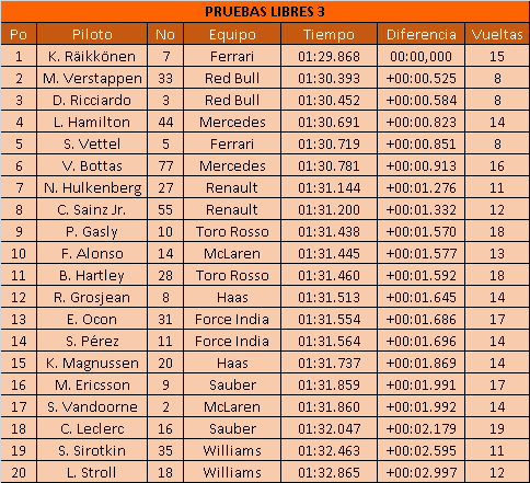 Kimi Raikkonen acabó la jornada de entrenamientos del sábado como líder en la tabla de tiempos, Max Verstappen confirma el buen ritmo de Red Bull con su 2º lugar y Daniel Ricciardo completa el top 3. Lewis Hamilton, Sebastian Vettel y Valtteri Bottas cierran el grupo de los 6 mejores.