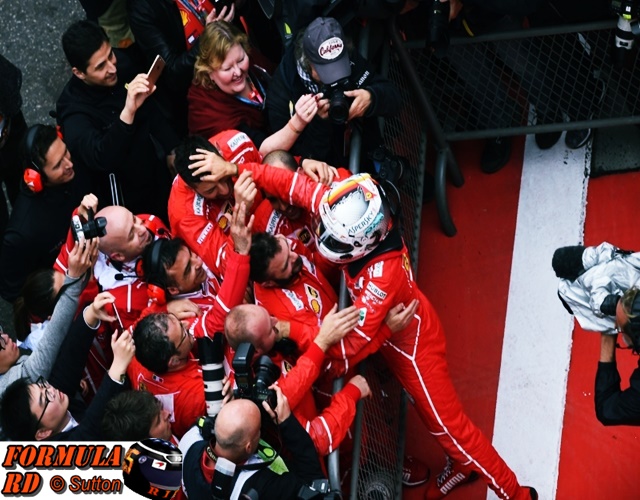Vettel, con la pista despejada alcanzó rapidamente a Verstappen que estaba segundo, pero el piloto holandés bajo presión sufrió una bloqueada en la frenada de la última horquilla que le hizo perder la posición y le obligó a entrar a boxes por segunda vez.
