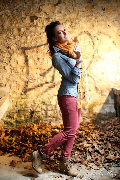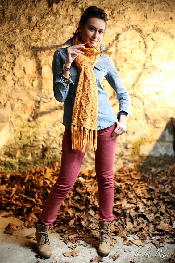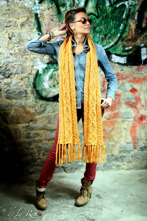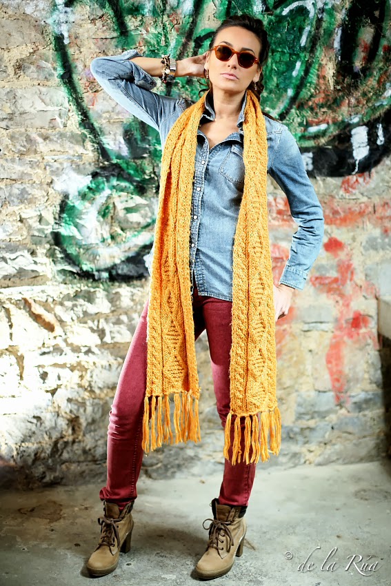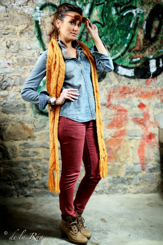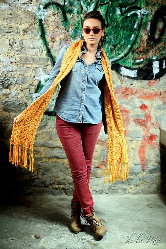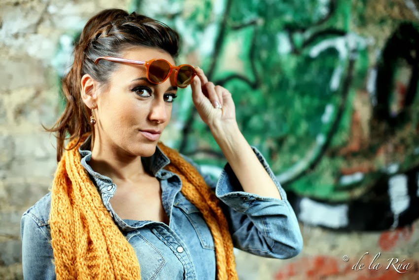 Lo vintage de las gafas, conjugado con este atuendo tan actual, en el que la bufanda comparte el mismo protagonismo que las lentes, en un escenario totalmente distinto y nuevo, da como resultado un estilo moderno, fresco y juvenil.