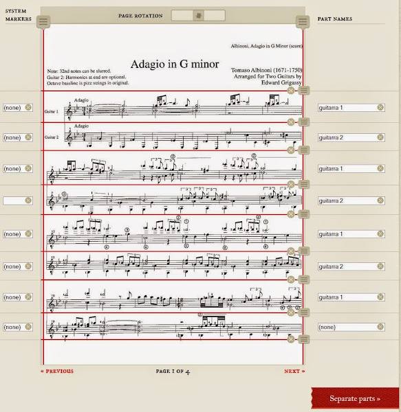 Una vez que se ha importado la partitura, veremos que se ha dividido cada página horizontalmente en varias partes que corresponden a los distintos sistemas de la partitura y también se han fijado las divisiones de los márgenes izquierdo y derecho. Se han de eliminar las zonas que no se hayan detectado bien y mover las divisiones horizontales hasta que se ajusten correctamente a los sistemas. Luego hay que dar nombre a cada una de las divisiones, nombres que corresponderán con el nombre de los instrumentos. Después de realizar todos los ajustes en las diferentes páginas se procede a obtener las partes separadas de cada instrumento.