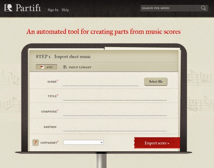 La web está en inglés pero su uso es muy intuitivo y bastante simple y dispone de ayuda en forma de vídeos. Hay que disponer de una versión en .pdf de la partitura, aunque también puede importarse directamente desde la librería de partituras de IMSLP si conocemos su número de registro en dicha base de partituras. Se indican los datos relativos al título, compositor, edición y copyright si se conoce y se importa la partitura.