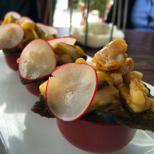 "Ceviche mixto con toques galegos e caipisour" , un ceviche de pescados y mariscos marinados en cítricos , ají y aromáticos con una combinación de sabores equilibrada y perfecta que se acompañaba de una refrescante caipiriña hecha al modo de un cóctel típico peruano llamado "piscosour" del establecimiento Tmos.