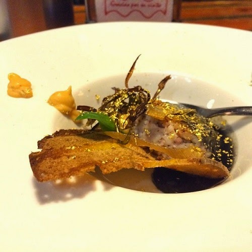 " O ouro do galeón, dobrón de xiba e polvo coa súa tinta e ouro" consistente en una mini hamburguesa de xibia y pulpo , bañada en su tinta y con brotes verdes y oro comestible , del establecimiento La Solana.