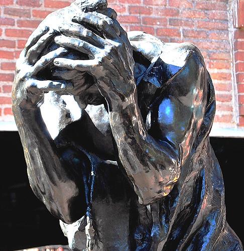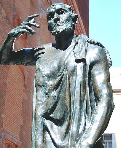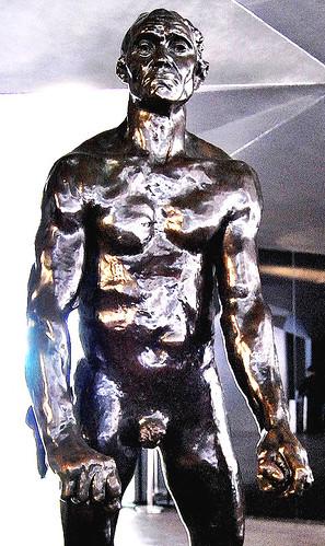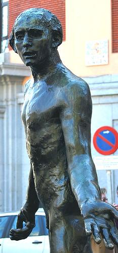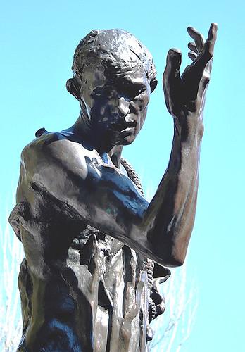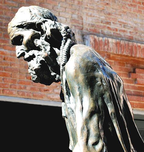 Siempre me ha enamorado Rodin y ha sido todo un honor el tenerle en mi país y poder deleitarme con sus tallas en mi tierra, con el sol que aquella mañana adornaba el cielo para decirle hola¡. Y mis ojos se llenaron de gris metalizado, de bronce oxidado, de belleza esculpida de hombres serios que me representaban muchos defectos y algunas virtudes de los hombres de carne y hueso y es así como me arriesgué a estudiar las seis esculturas que forman Los Burgueses de Calais puestas de manera aisladas unas de las otras, aunque la idea primaria era un conjunto y que curiosamente si se ve todo junto, los movimientos de cada figura se emparejan con los de las demás; es un todo que aquí hemos dividido en muchos unos… Compuesto por seis figuras que tienen su inspiración un episodio de la Guerra de los Cien Años cuando el rey inglés Eduardo III se hizo con la ciudad francesa y obligó a seis paisanos a entregarse para ser ajusticiado a cambio de salvar la ciudad, Fue idealizada por el autor como un grupo pero a su vez individualizado para que pudiesen interconectar tanto en conjunto como cada uno por su lado.