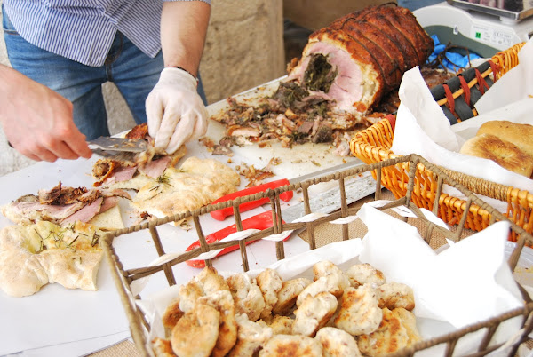 Que comáis y bebáis sin contar calorías, (ya lo he dicho, pero lo repito) si vas a Italia, olvida las dietas, porque todo, todo, todo está de muerte y casi nada es ligero. Es el típico país en el que desearías tener un estómago tres veces más grandes para probarlo todo :-). Pero si me quedo con una cosa (salada) es con la Porqueta, una especie de embutido de carne de cerdo rellena que puedes encontrar en las Charcuterías o en los mercados y que ellos mismos te preparan en bocadillo. Si puede ser con pan de focaccia o pizza bianca mejor que mejor.