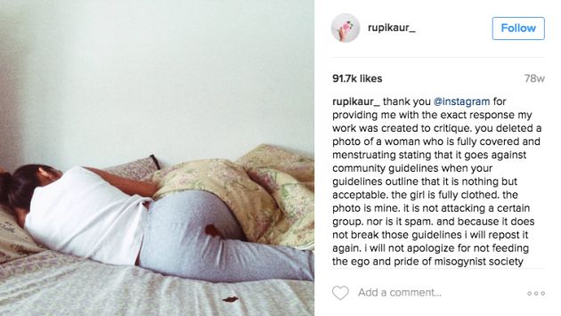 Kaur, de 26 años, revolucionó las redes sociales por una imagen en su cuenta personal de Instagram en la que aparece manchada de sangre de la regla. La escritora se ha convertido en todo un acontecimiento literario y feminista. Ella misma se define como una mujer meticulosa, y es que además de escribir también se encarga de mediar el espacio, cuadrar la ilustración con la página o elegir el color.