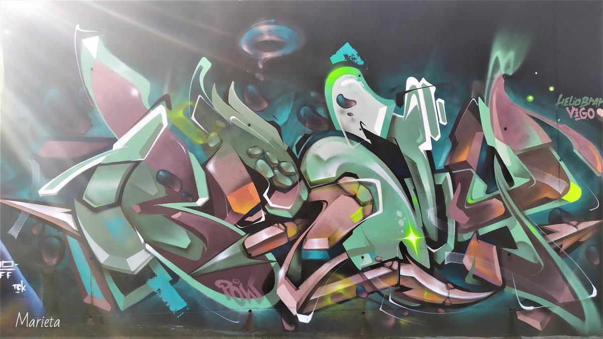 Caminamos hasta la entrada del parque que se extiende frente al complejo “Máis que auga” donde encontramos un espacio que ha sido decorado por el grupo de artistas que han intervenido en el certámen de graffiti “Cíes Talent”, organizado por el ayuntamiento. Un proyecto que forma parte de las actividades que promueven la candidatura de las islas Cíes a patrimonio de la humanidad. Artistas locales, nacionales e internacionales reunidos bajo la coordinación del también artista de nuestra ciudad Powone, han llenado de arte y color este entorno.