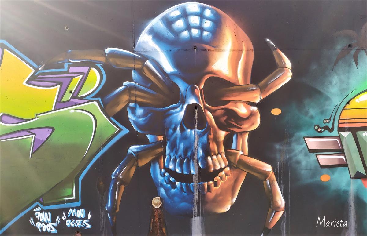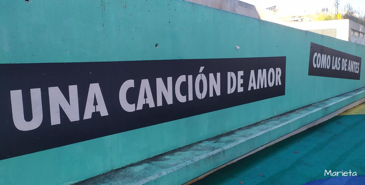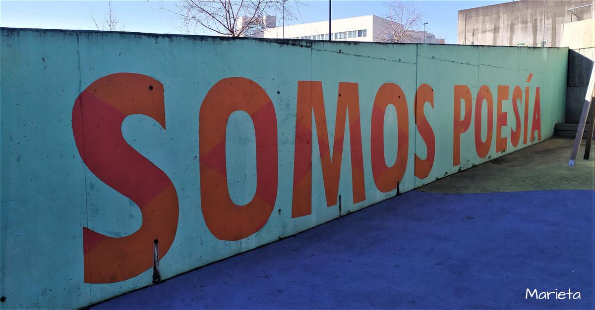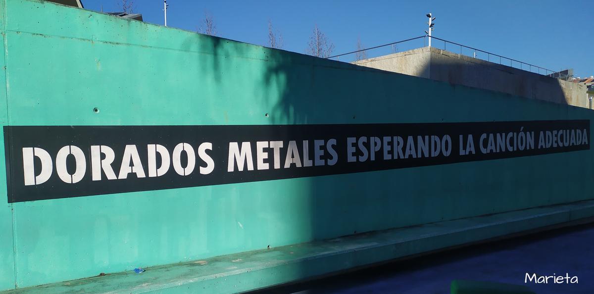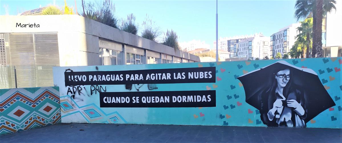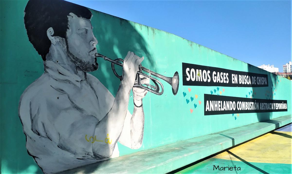 Nos acercamos ahora a la zona del parque infantil. Aquí el colectivo Proyecto Ewa formado por artistas, fotógrafos, diseñadores y poetas, ha llenado los muros de arte y poesía bajo el lema “ni muros grises ni personas grises”. La figura de un trompetista interpretando un poema es obra de David Arambarri.