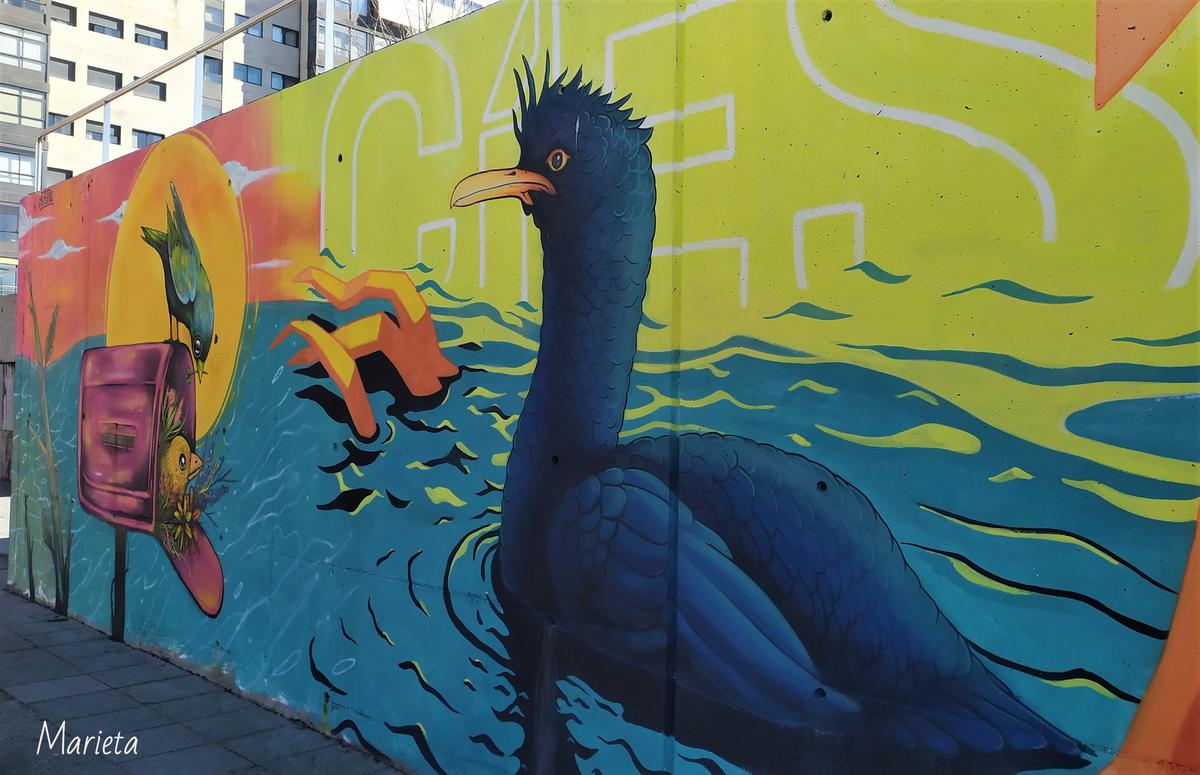 El artista Moisés Vargas, @kol3jo, forma parte del colectivo chileno/español Pekolejo, dedicado a la pintura mural, diseño, ilustración y artes gráficas. Ha elegido pintar una de las aves emblemáticas de las Cíes, el cormorán.