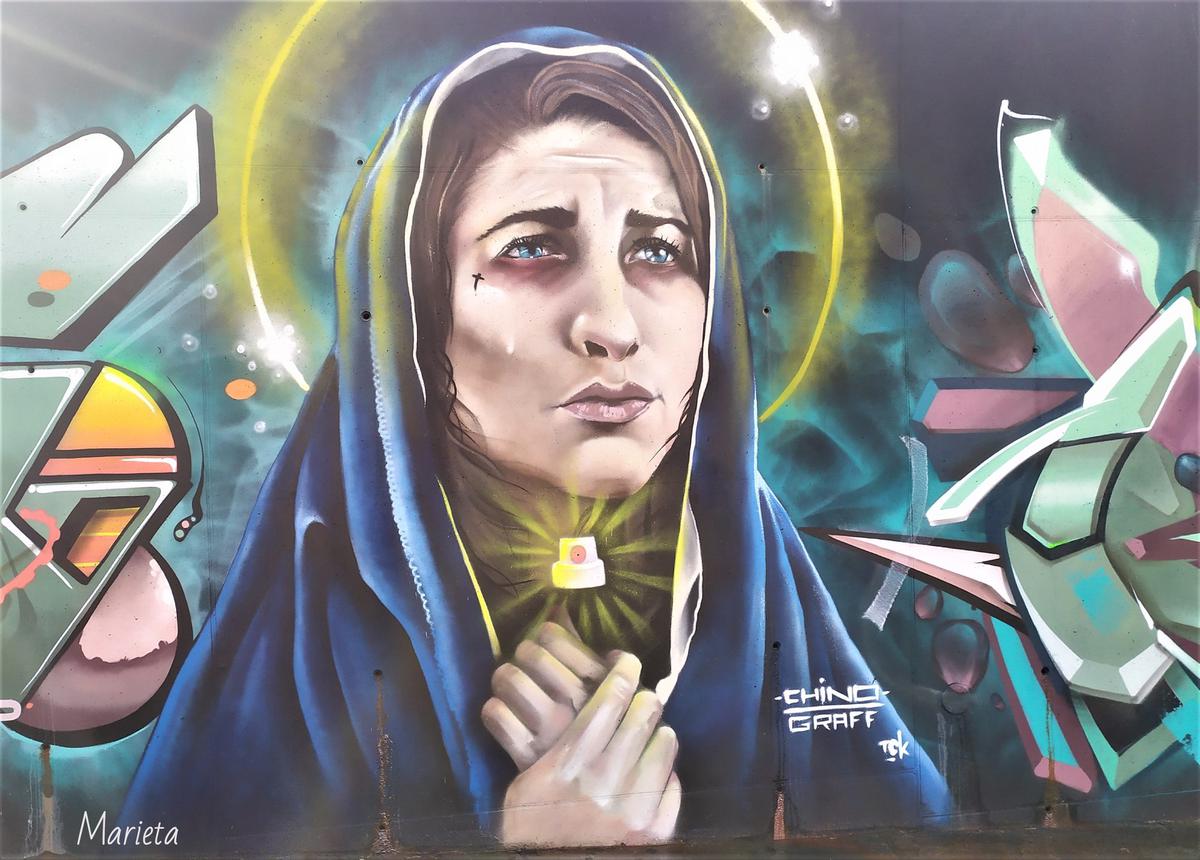 Esta cabeza semi transparente de niña abrazada por las olas, en las que se refleja la silueta de las Cíes es obra del artista extremeño Alejandro Pajuelo, más conocido como Chino Graff. También lo es la imagen de esta “santa”.