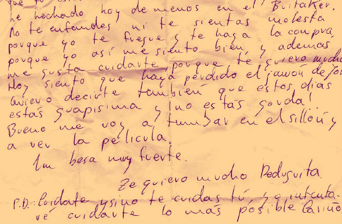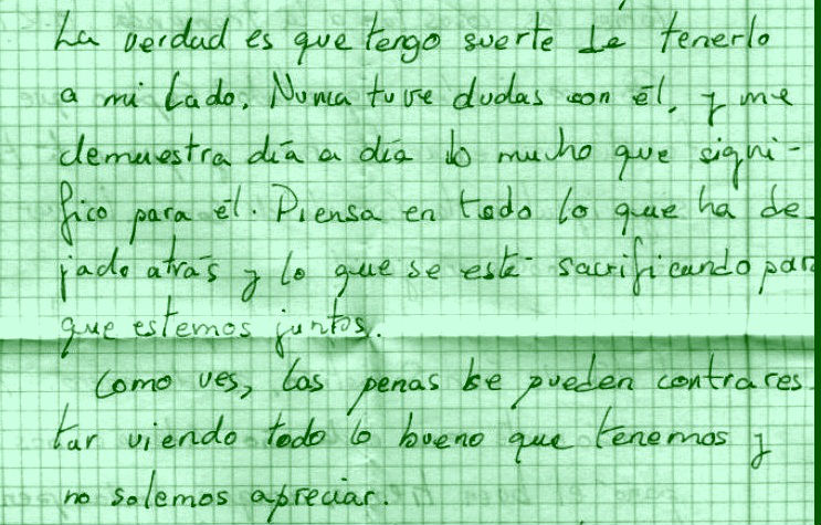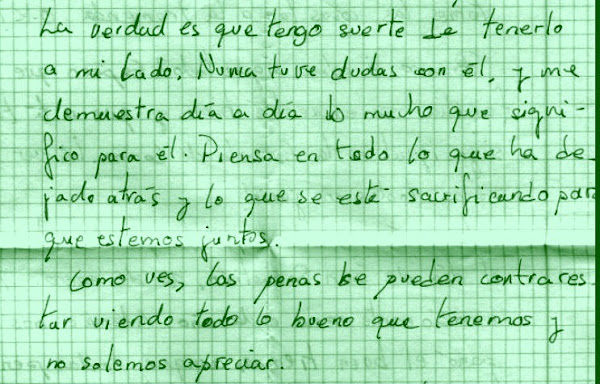 Das recuerdos a tu madre y le dices que yo también me acuerdo de ella, y de tu padre también aunque me gaste bromas, también de tus hermanos. Pero del que me estoy acordando siempre es de ti que eres mi única ilusión. Si tuviera alas para volar, siempre estaría contigo pues solo soy feliz cuando estoy junto a ti. Los días se me hacen muy largos, siempre estoy pensando en recibir tus cartas, pues es la única alegría que aquí tengo.