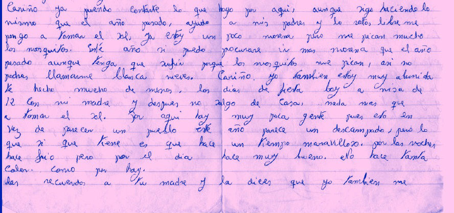 Cariño, ya puedo contarte lo que hago por aquí, aunque sigo haciendo lo mismo que el año pasado: ayudo a mis padres y los ratos libres me pongo a tomar el sol. Ya estoy un poco morena, pero me pican mucho los mosquitos. Este año si puedo procuraré ir más morena que el año pasado aunque tenga que sufrir porque los mosquitos me pican, así no podrás llamarme Blancanieves. Cariño, yo también estoy muy aburrida. Te echo mucho de menos. Los días de fiesta voy a misa de 12 con mi madre y después no salgo de casa, nada más que a tomar el sol. Por aquí hay muy poca gente pues esto en vez de parecer un pueblo este año parece un descampado, pero lo que sí que tiene es que hace un tiempo maravilloso; por las noches hace frio, pero por el día hace muy bueno. No hace tanta calor como por ahí.