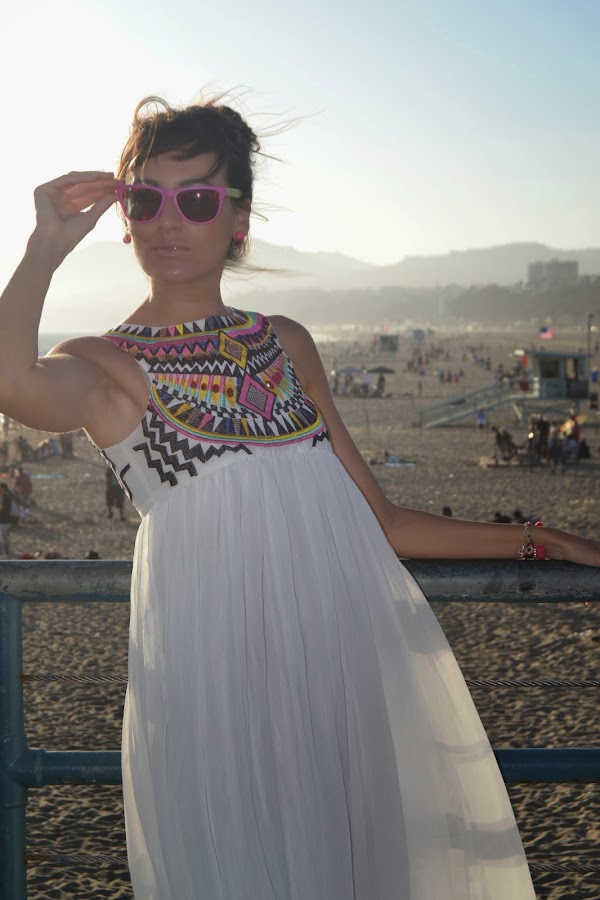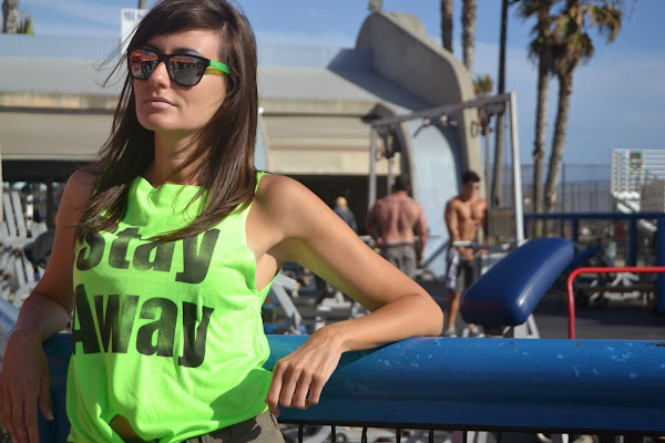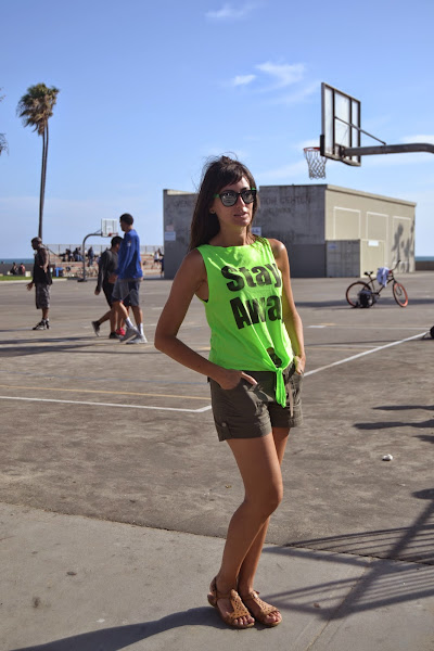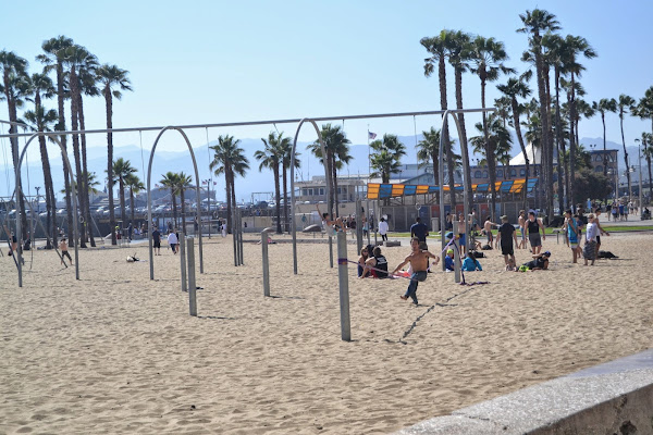 la playa conocida como la Muscle Beach (donde siempre podemos ver culturistas entrenando mientras el sol del atardecer ilumina su anatomía),
