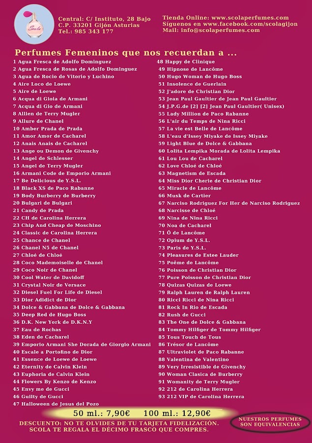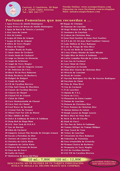 Scola Perfumes es un nuevo concepto de perfumería de alta calidad, con personalidad propia y precios muy asequibles en la que podemos encontrar más de 170 referencias en perfumes de equivalencia femeninos, masculinos e infantiles, que nos recuerdan a grandes marcas mundialmente conocidas por todas, con la misma duración, pero a precios inigualables (desde tan sólo 7,90 Euros), que gozan de gran aceptación entre el público. Podría atreverme a decir incluso, que estos perfumes son un lujo al alcance de cualquier bolsillo. De ahí que en poco tiempo, Scola Perfumes se haya convertido en todo un referente en su sector desde que Claudia, su dueña, abriera sus puertas hace tan sólo un año con el objetivo de unir la fórmula tradicional de venta a granel, con las mejores tendencias olfativas de perfumes del mercado.