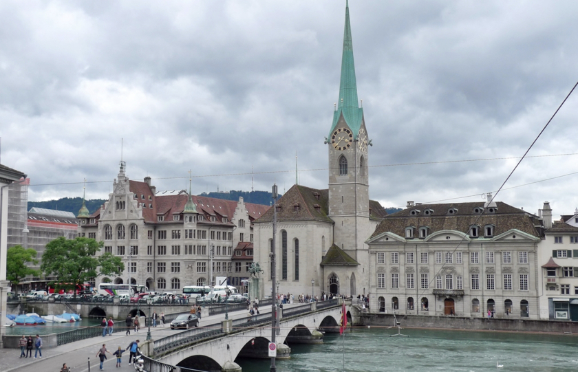 Catedral, Grossmünster, templo de culto protestante y estilo románico con elementos góticos junto al río Limmat. Destaca por sus campanarios gemelos.