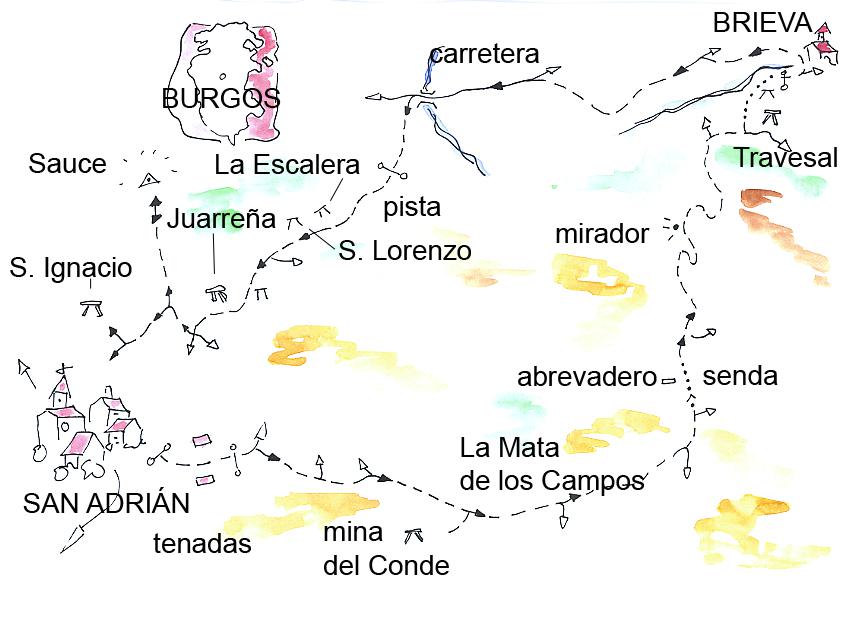 EL PASEO. Aparece perfectamente señalizado como sendero de pequeño recorrido PR.C.BU-56. Se trata de un paseo circular, con principio y final en San Adrián de Juarros de unos 10 kilómetros de longitud y que puede recorrerse en unas cuatro horas. También puede hacerse en bicicleta de montaña. En este caso el tramo más complicado es el corto sendero que enlaza el Travesal de los Villares con Brieva. La excursión se disfruta más si se dispone de pequeñas linternas para explorar la entrada de alguna de las minas que han sido acondicionadas para ello. Ayuntamiento: tel. 947 42 10 15.