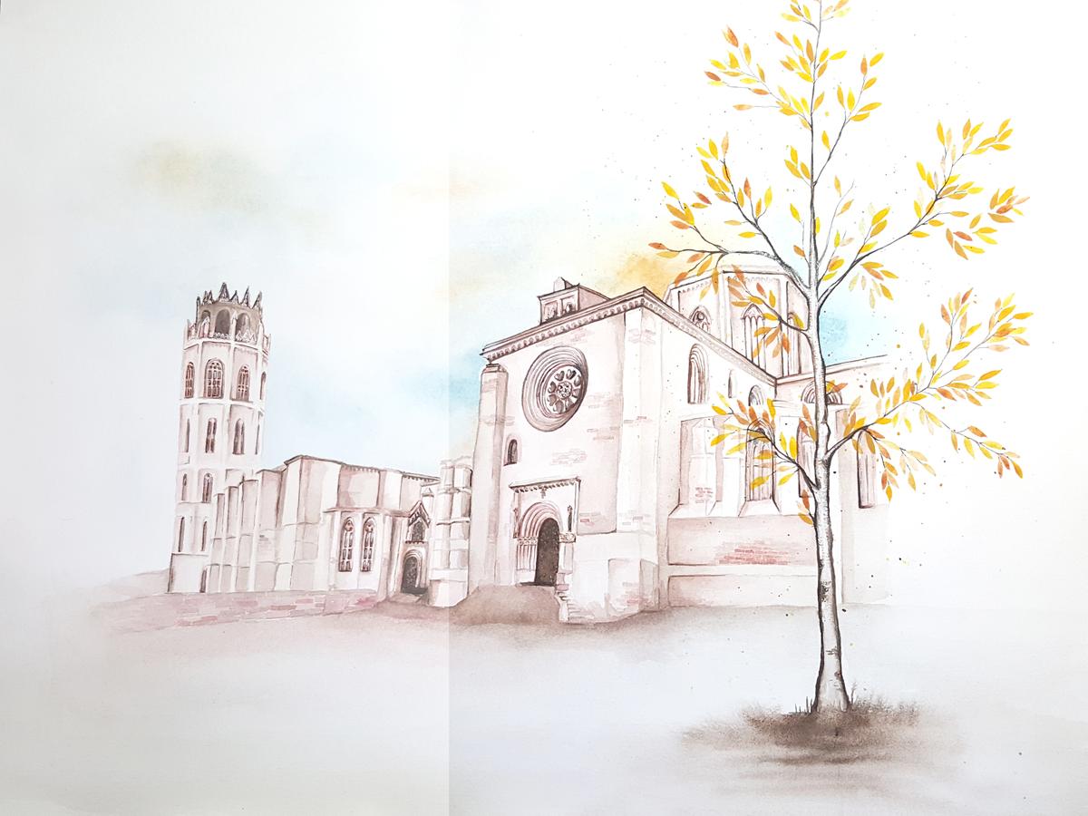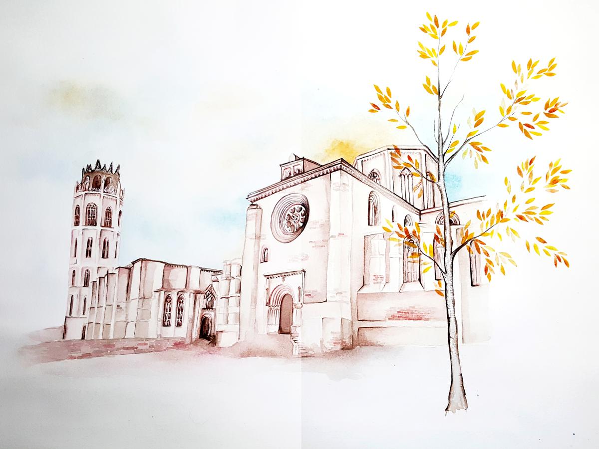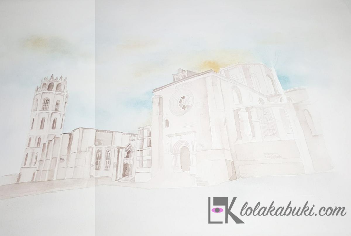 Seu Vella (Seo Vieja en castellano) se construyó en estilo románico (XIII), aunque con el paso del tiempo, fue incorporando a su diseño elementos y estructuras arquitéctónicas de otros estilos. Como por ejemplo el estilo gótico en sus bóvedas de crucería que se pueden apreciar en el interior, su claustro contruído entre el siglo XIII y XIV o el campanario del siglo XV con el que se finalizó la construcción.La verdad es que nunca me ha gustado demasiado pintar edificios. No me siento cómoda, quizá porque me gusta la pintura un poco más expresionista y me resulta complicado transmitir a trvés de un edificio. Con un paisaje natural es más fácil. Puedes incluir elementos de fantasía, o incluso elementos vivos y movimiento. Pero los edificios siempre me han parecido muy fríos, por muy icónicos o conocidos que estos sean.