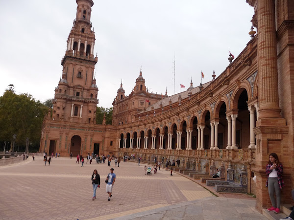 La Plaza de España...uf! es imposible de describir con palabras. Creo que es lo que más me impresionó junto con la Giralda. Es enorme, es imposible fotografiarlo todo en una sola instantánea. A nosotros nos pilló nublado y anocheciendo así que no sé si las fotos son merecedoras de su encanto.