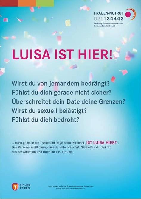 ¿Estás siendo acosada por alguien?, ¿No te sientes segura en este momento?, ¿Tu cita se está pasando de la raya?,¿Estás sufriendo abusos sexuales?,¿Te sientes amenazada? Estas son algunas de las preguntas que plantea el programa ‘Ist Luisa hier?’ Puesto en marcha en 2016, desde el Frauen-Notruf de Münster, está incluido dentro de la campaña de prevención y celebración segura en el ocio nocturno que promueven desde este centro. La iniciativa va dirigida a todas las mujeres que quieren disfrutar de una noche de diversión tranquilas y que, en ocasiones, se ven acosadas por algún hombre que hay en el local o por la persona con la que tenían una cita.