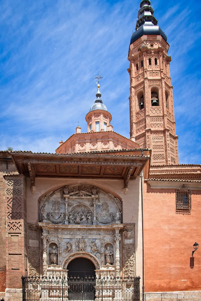 Su espectacular portada con tejadillo policromado es de 1528 y el interior es barroco del siglo XVII. De la original se conserva la torre octogonal con 70 metros de altura constituyendo el perfil de Calatayud (su skyline), constituyendo uno de los principales ejemplos del mudéjar aragonés.