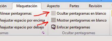 De forma similar, si se quiere mostrar algún instrumento en silencio que se haya ocultado previamente habrá que marcar los compases en los que se quiere mostrar de nuevo el instrumento y elegir "Maquetación - Mostrar pentagramas en blanco" o pulsar: CTRL + ALT + MAYS + S