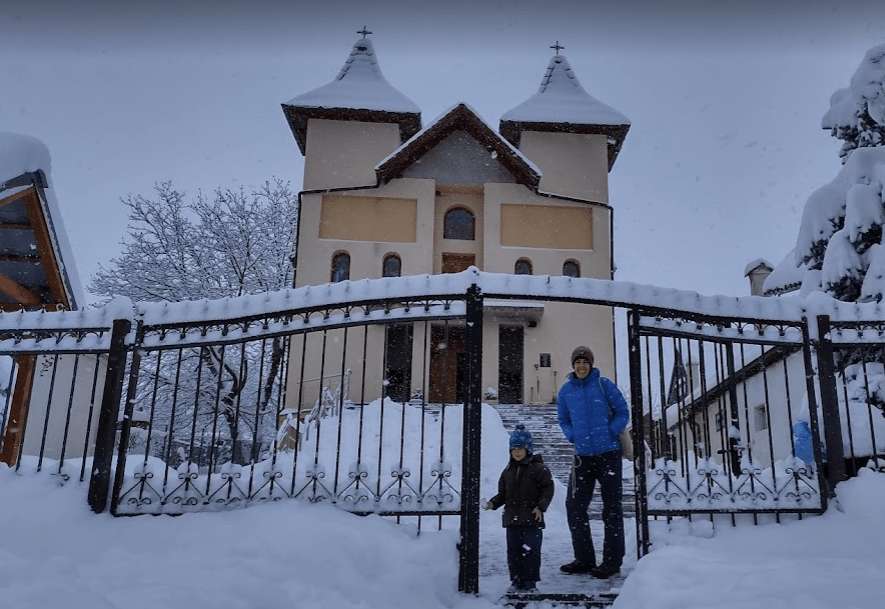 Cogimos un UBER que nos llevó a Cisnadie para ver una Iglesia Fortificada en lo alto de una colina, pagamos cerca de 11€ pero al llegar no se podía subir por la cantidad de nieve que había, habían cerrado el acceso y nos fuimos a visitar la Iglesia Ortodoxa del pueblo dónde estaban celebrando el cumpleaños del párroco. A esta fiesta fuimos invitados y disfrutamos del calor y la amabilidad de su gente.