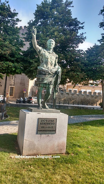 Nos encontramos esta maravilla en el Campo Valdés, custodiando las termas romanas. Fue encargada en 1971 para celebrar el bimilenario de Gijón. Esta réplica del Octavio Augusto de Prima Porta, hallado en Roma, es obra del escultor de Béjar Francisco González Macías y mide algo más de tres metros. En otro post hablaré de los restos romanos que tenemos, algunos son increíbles, y han sido parte importante de mi infancia.
