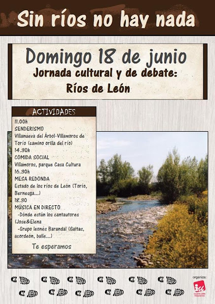 Comida social (tipo bocadillos, tortilla...)16.00 h. MESA REDONDA (puntos de vista) Estado de los ríos de León y puesta en común de acciones para paliar su deterioro. Torío, Bernesga... (otros...) (Con la participación de pescadores, ULE, ecologistas, concejales/as de zonas afectada, Diputado Provincial...etc) 18.00. h. Música en directo - DÓNDE ESTÁN LOS CANTAUTORES (voz y guitarra) José&Elena19.30h BARANDAL gaitas, acordeón, dulzainas...baile (horarios aproximados y sujetos a variación).