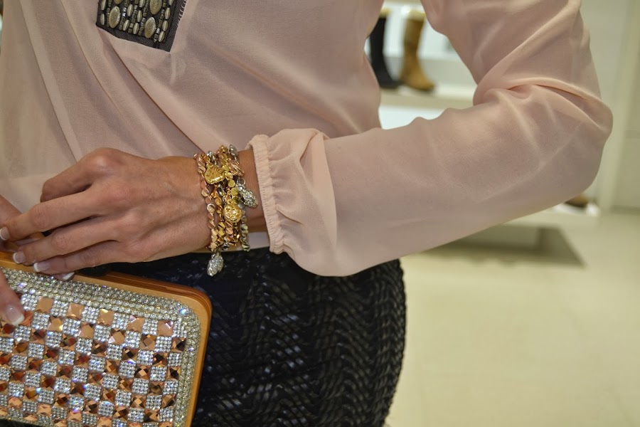 y lo combiné con un original bolso de mano con forma de caja rígida en dorado, decorado con motivos de fantasía como piedras de cristal y un juego de llamarivas pulseras, también en tonos brillantes para disfrutar a tope de la nightlife.