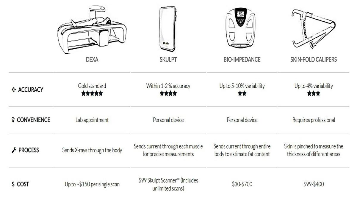 La tecnología empleada por los dos modelos de la marca SKULPT: Aim y Chisel es capaz de medir el porcentaje de de Grasa Corporal con un nivel de fiabilidad cercana a la de dispositivos con calificación “Gold Standard” de máxima precisión, que hasta el momento sólo es alcanzado por métodos como el DEXA o Densitometría Dual Computada, técnica considerada como la más eficaz para la estimación de la CCO (Composición Corporal del Organismo) ya que el cálculo de error es muy pequeño (entre 2 y 4%).