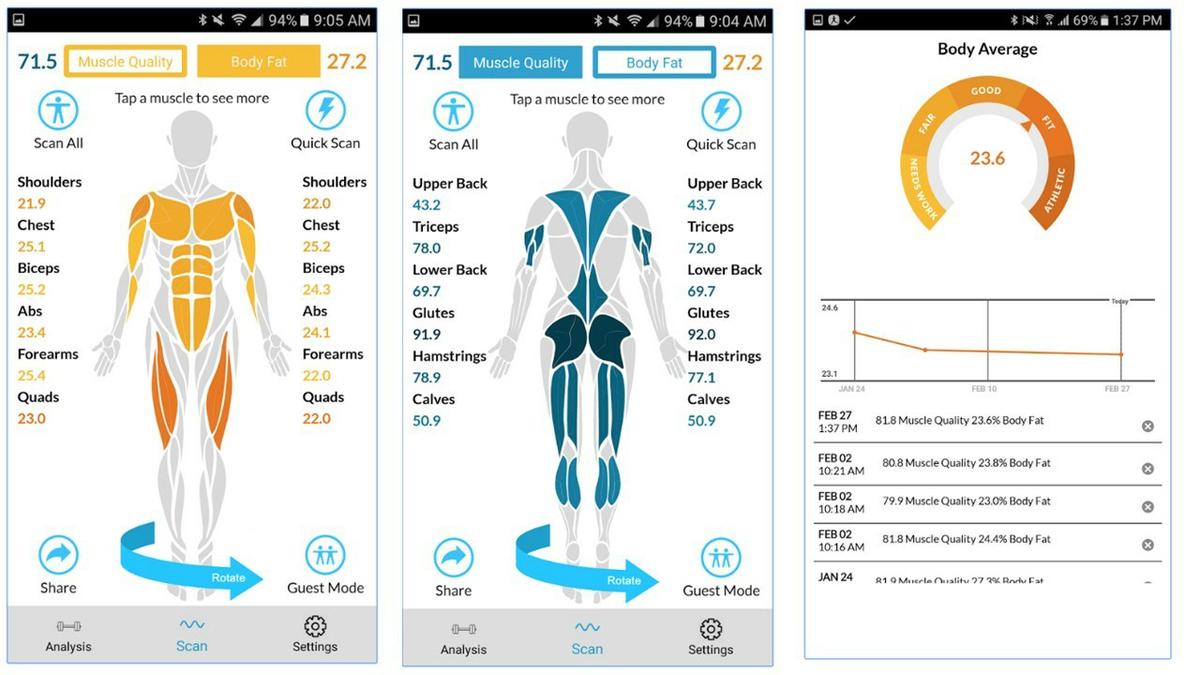 Mediante la combinación de estas configuraciones de electrodos múltiples con mediciones eléctricas de múltiples frecuencias, y utilizando gran variedad de algoritmos, el SKULPT SCANNER es capaz de separar la condición del músculo de la cantidad de grasa por región corporal.