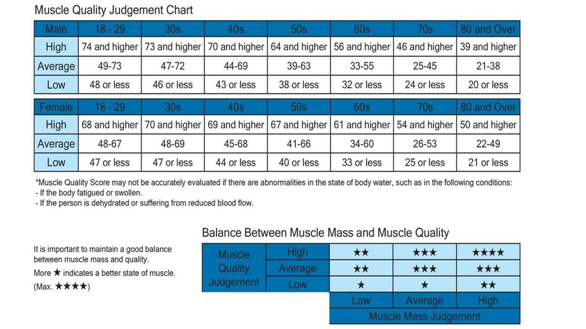 La Calidad Muscular es una medida de la fuerza de su músculo, en relación con su tamaño. Se basa en una escala de 0 a 100. Una mayor calidad muscular se relaciona con músculos más fuertes, más delgados y más aptos. La puntuación obtenida se clasifica en una de las cinco categorías de aptitud: