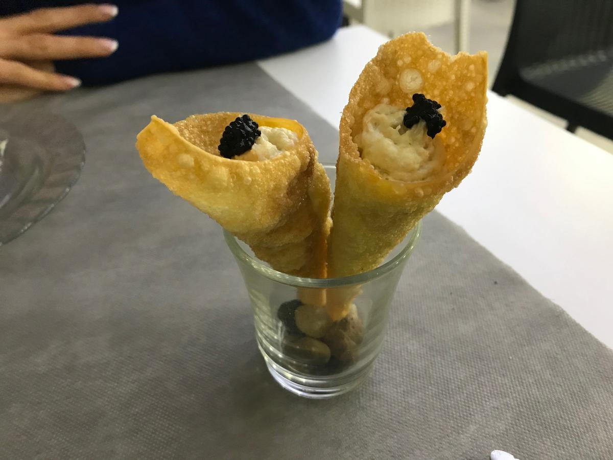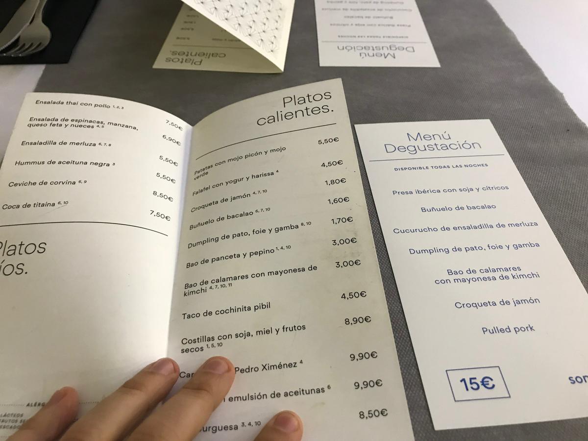 La recomendación de la camarera fue lo que ya tenía decidido a probar: el menú degustación. Platos del menú (marzo 2019): presa ibérica con soja y cítricos, buñuelo de bacalao, cucurucho de ensaladilla de merluza, dumping de pato foie y gambas, bao de calamares, croqueta de jamón y pulled pork.