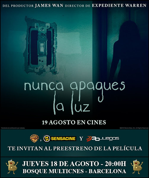 Con motivo del estreno de ¨Nunca apagues la luz, sorteamos ¨2 ENTRADAS DOBLES para el preestreno de la película el jueves 18 de agosto a las 20:00 en Bosque Multicine de Barcelona cortesía de nuestros amigos de Warner Bros y Blogos de oro.