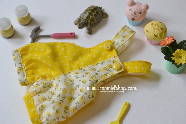 Estuve pensando mucho en qué regalar, dudé entre varias cosas, pero se me encendió la bombilla. En ese momento tenía a mi pequeña Brenda delante, con el precioso peto de flores rojas de Ronmiel, y me dije: ¡ostras, un peto de María! Así que me puse en contacto con ella y le pareció genial, hasta lo ha hecho con telas especiales exclusivas para el sorteo. María es la personita que hay detrás de Ronmiel shop, una de mis modistas-costureras preferidas para Blythe.